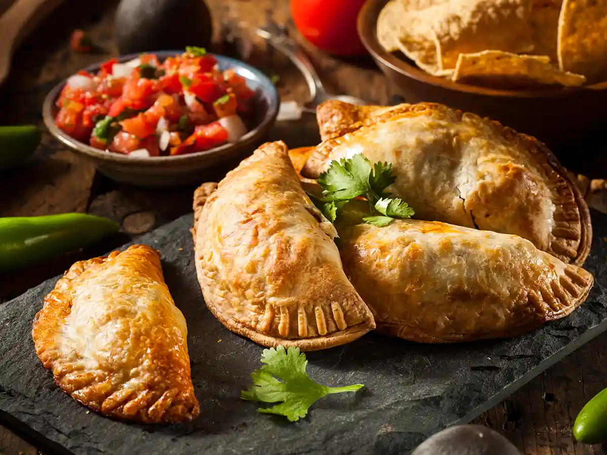 Empanadas: Semi-circular turnovers from Latin America and Spain, with diverse fillings like cheese, chicken, or beef.